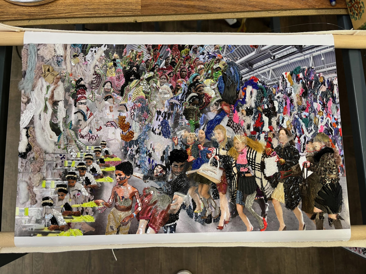 Cette création artistique lui permet un certain moyen d’expression. En effet, à travers différents projets, Emmanuelle met le doigt sur des sujets sensibles de la société ; tel que la surconsommation. Chez Emuska, la broderie n’est pas seulement utilisée pour créer des accessoires. Avec des matières de récupération, la créatrice réalise des tableaux et œuvres aux messages forts. En travaillant plusieurs matériaux, la dimension des œuvres d’Emmanuelle prend plus de contrastes. Grâce à la broderie, et au recyclage, la marque modernise la broderie. Vous trouverez ci-dessous, différents projets, tous réalisés avec les techniques de broderie (et des matériaux aussi farfelus les uns les autres)